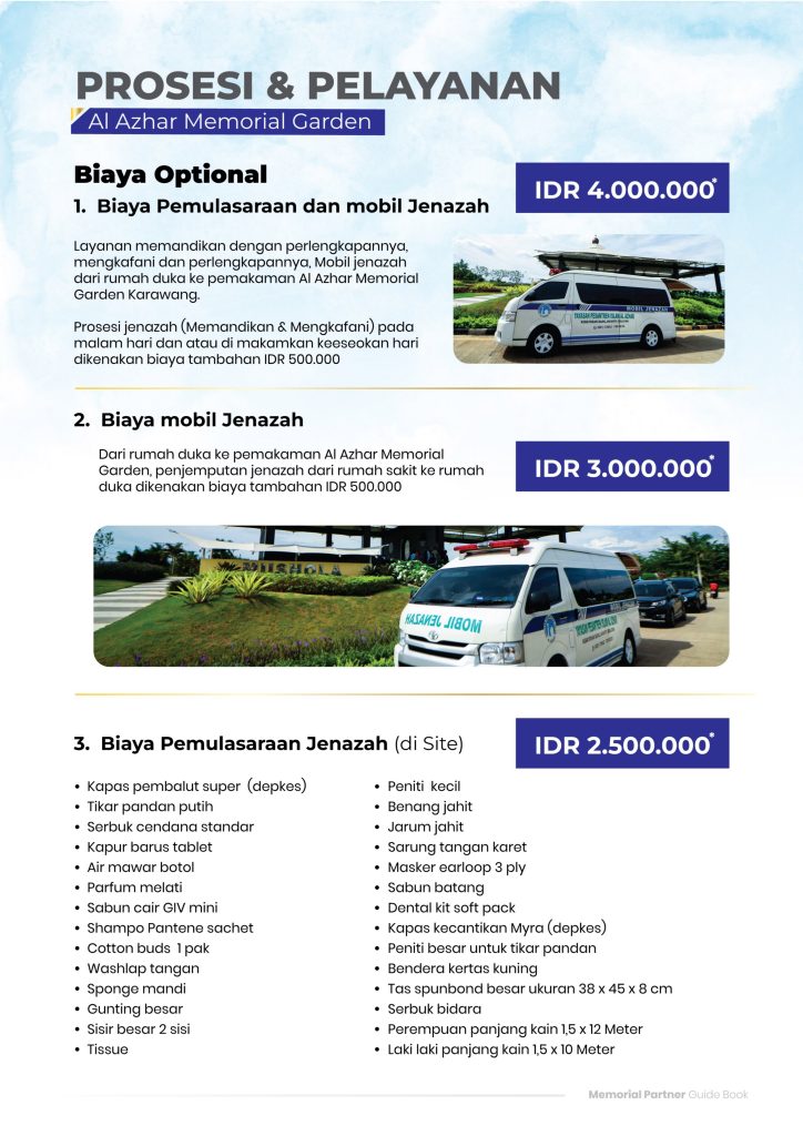 HARGA PAKET PELAYANAN Harga Pelayanan Prosesi PemakamanAl Azhar Memorial Garden Untuk informasi yang lain, Harap klik Link sesuai pilihan di bawah ini: 1. Company Profile Al Azhar Memorial GardenDAFTAR HARGADaftar Harga MakamDaftar Harga PelayananDaftar Harga Tomb & LandscapeTIPE PRODUK SingleSingle VariantDoubleSuper DoubleFamily ASuper Family ARoyal Family A HUBUNGI VIA WHATSAPP 1. Kembali ke WA Perusahaan 2. Hubungi WA Marketing AMG
