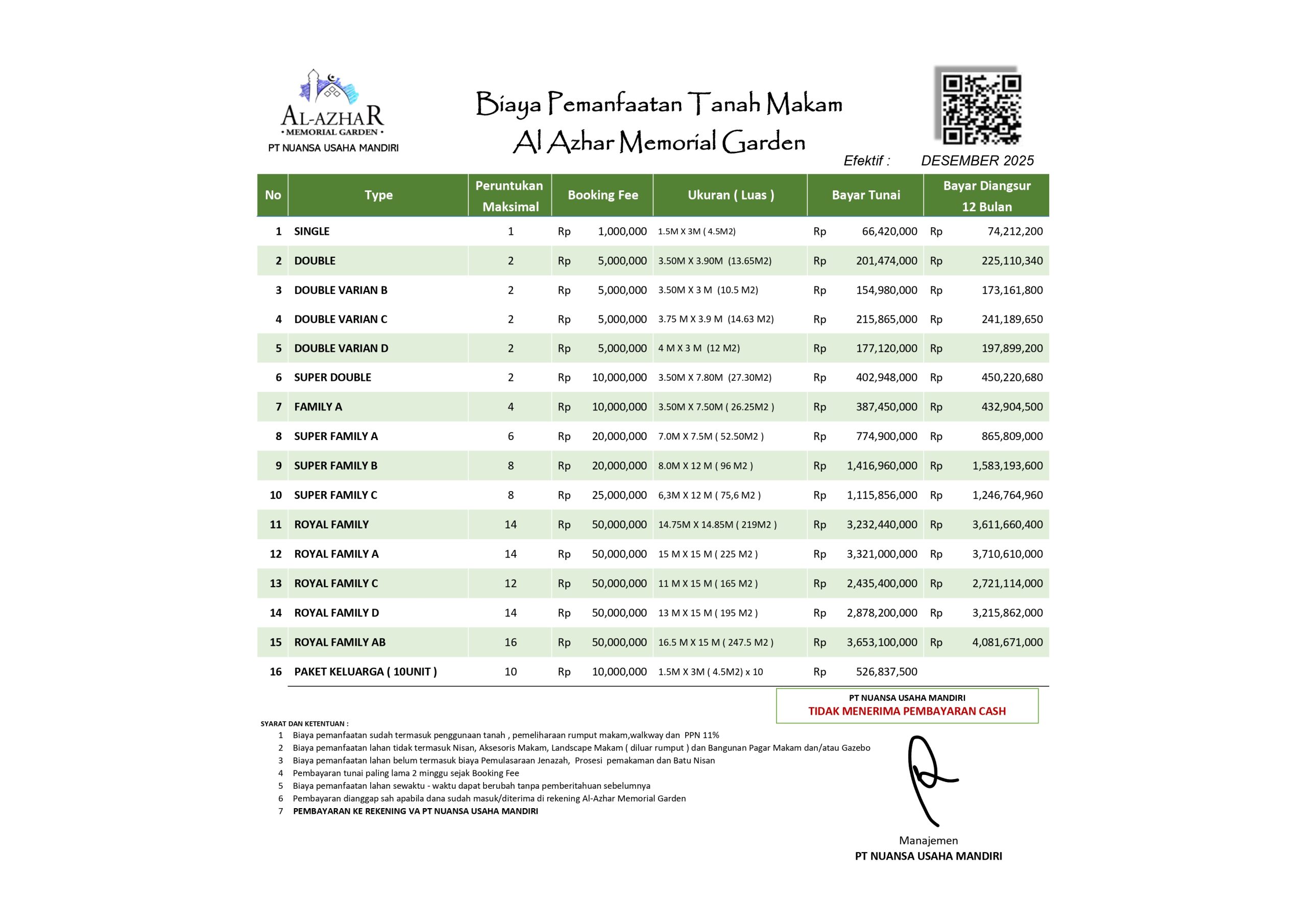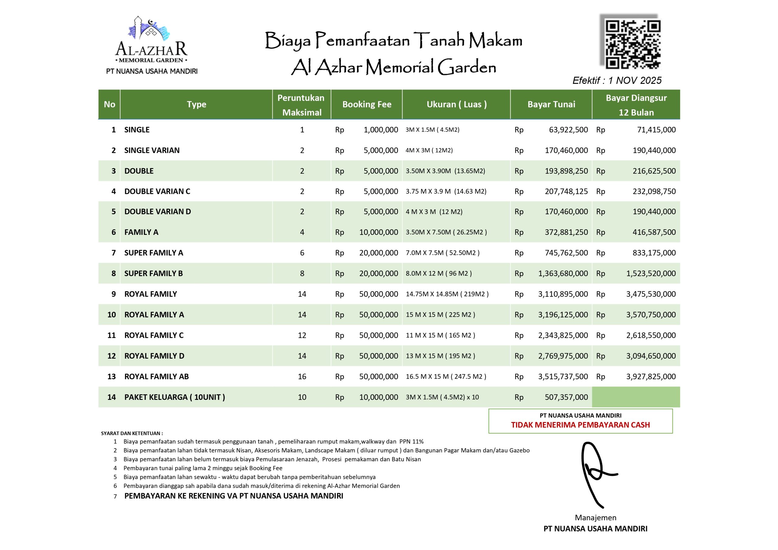 Price List Harga Makam Al Azhar Memorial Garden Untuk informasi yang lain, Harap klik Link sesuai pilihan di bawah ini: 1. Company Profile Al Azhar Memorial GardenDAFTAR HARGADaftar Harga MakamDaftar Harga PelayananDaftar Harga Tomb & LandscapeTIPE PRODUK SingleSingle VariantDoubleSuper DoubleFamily ASuper Family ARoyal Family A HUBUNGI VIA WHATSAPP 1. Kembali ke WA Perusahaan 2. Hubungi WA Marketing AMG